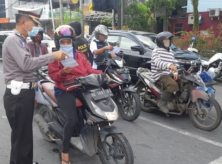 Dalam operasi tersebut, pengguna jalan yang tidak memakai masker akan diberikan teguran dan dibagikan masker serta dipasang stiker pada kendaraanya agar tetap memakai masker. (Leodepari/red)