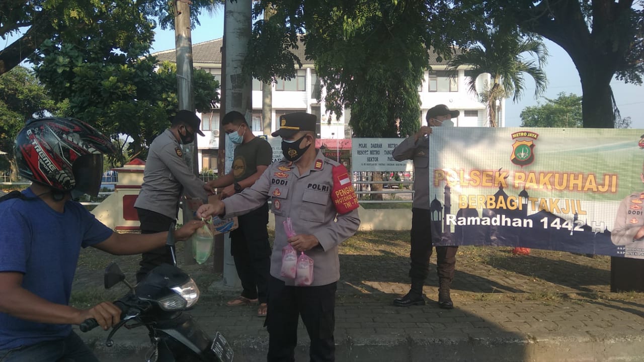 Tangerang, skalainfo.net | Selama bulan Suci Ramadhan 1442 H Polsek Pakuhaji melaksanakan kegiatan pembagian takjil secara rutin seminggu 2 kali setiap hari Rabu & Sabtu sebanyak 100 bungkus kepada pengguna jalan yang melintas di depan kantor Polsek Pakuhaji.