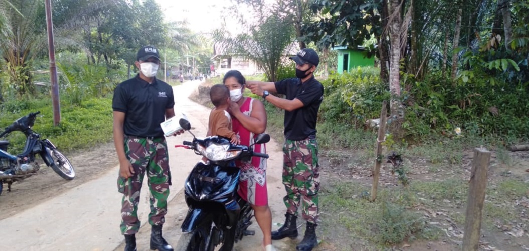 Bengkayang, Skalainfo.net| Sebagai upaya mencegah dan menanggulangi penyebaran Covid-19, Satgas Pamtas RI-Malaysia Yonif 642/Kapuas yang berada dibawah Komando Pelaksana Operasi (Kolakops) Korem 121/ABW, memberikan himbauan kepada warga untuk melaksanakan disiplin protokol kesehatan dengan membagikan masker kepada masyarakat Dusun Kindau, Kecamatan Jagoi Babang, Kabupaten Bengkayang, Kalimantan Barat.