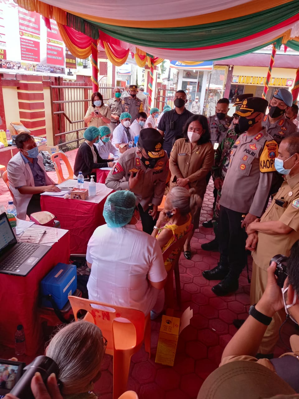 Dalam kunjungan kerjanya, Kapolda Sumut yang didampingi Bupati Samosir Vandiko T Gultom ST, Dandim, Kajari dan Para Kepala Dinas meninjau proses vaksinasi yang diberikan kepada personil Polres Samosir, Lansia, Guru, Warakuari, dan Tokoh Agama bertempat di Mapolres Samosir.