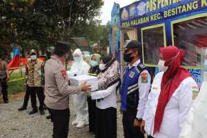 Usai memberi himbauan, Kapolda Sumut dan Pangdam I/BB memberi bingkisan kepada petugas yang melaksanakan tugas di Pos Penyekatan III Jalinsum Aceh-Medan.