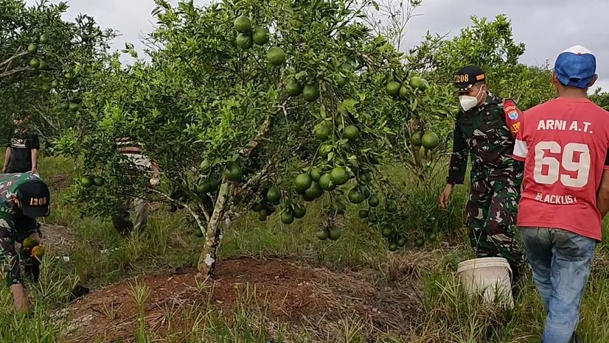 Kodim 1208/Sambas melalui Koramil 1208-03/Tebas, Bintara Pembina Desa (Babinsa) Praka Zainudin bersama Serda Andre saat berada di perkebunan jeruk bersama masyarakat dan petani jeruk di Desa Makrampai, dalam mendukung pertumbuhan ekonomi masyarakat pada saat situasi pandemi Covid- 19.