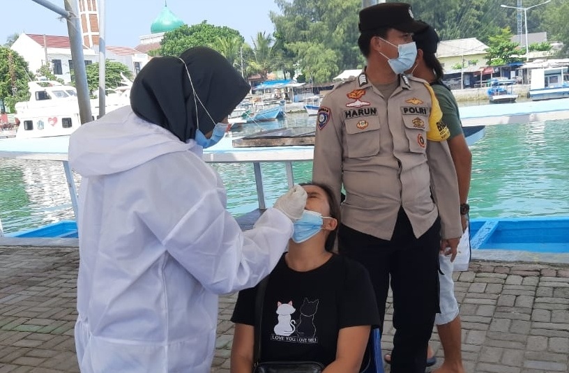 Asep menambahkan, personel nya bersama Tim Kampung Tangguh Jaya di Dermaga Kedatangan melakukan pemantauan penerapan protokol kesehatan, memeriksa Surat Negatif Covid-19 bagi wisatawan dan melakukan Swab Antigen warga pulau.