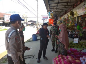 Anggota Koramil 06/Selakau Kopda Teguh P. bersama anggota Polsek Selakau dan Forum Koordinasi Pimpinan Kecamatan (Forkopincam) Kec. Selakau melaksanakan imbauan dan pembatasan kerumunan di Pasar Selakau, serta membagikan masker.