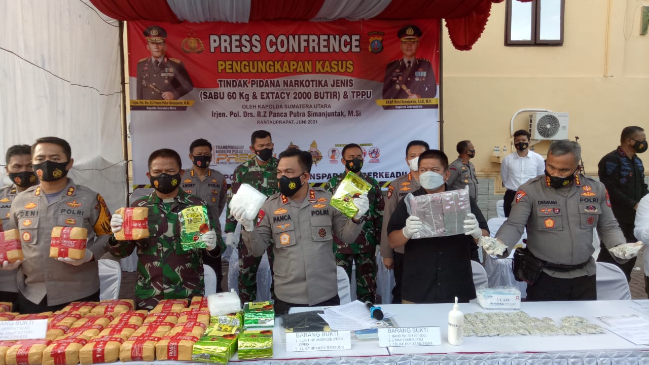 Kapolda Sumatera Utara (Sumut), Irjen Pol Drs RZ Panca Putra Simanjuntak MSi, bersama Pangdam I/Bukit Barisan, Mayjen TNI Hassanudin SIP, MSi, didampingi Kapolres Labuhanbatu, AKBP Deni Kurniawan, dan Kasat Narkoba, AKP Martualesi Sitepu, mengungkapkan hal ini dalam konferensi pers yang digelar di Mapolres Labuhanbatu di Rantauprapat, Jum’at sore (18/6/2021).