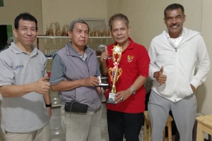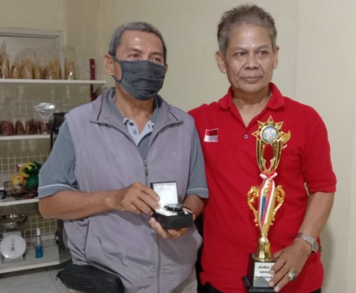 Rasa bangga dan bahagia piala juara 1 diboyong pulang oleh pasangan lomba domino Syafrizal dan Ai, serta membawa perangkat lainnya hasil hadiah pra lomba domino IKM Kota Tangsel. (Red/Siswo).