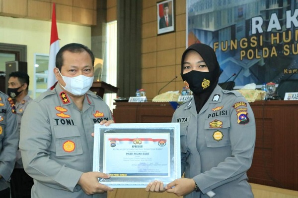 Penyerahan penghargaan tersebut diserahkan Polda Sumatera Barat (Sumbar), pada agenda rapat kerja teknis (rakernis) untuk fungsi Humas T.A 2021, Kamis, (24/6/2021)
