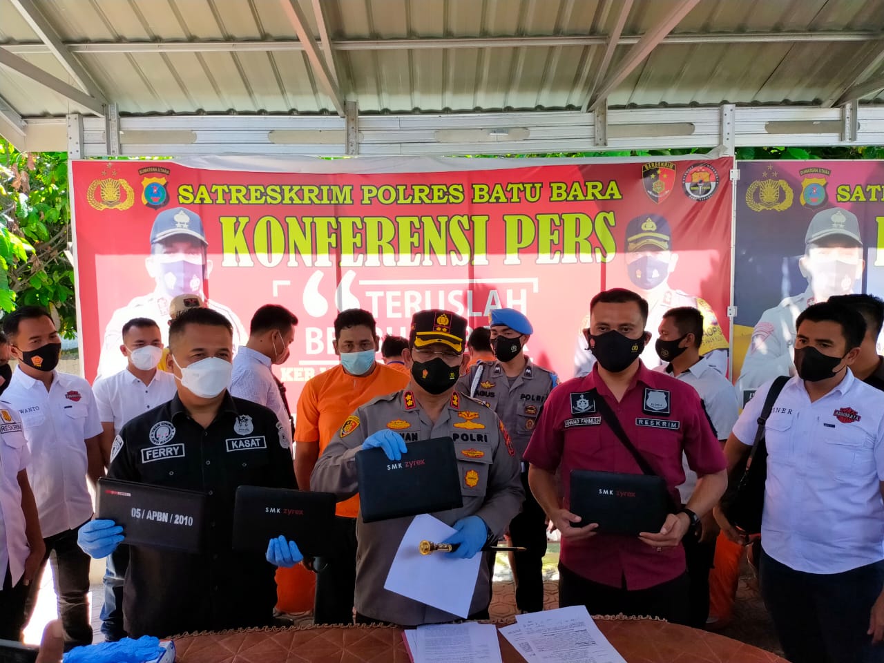 Dan barang bukti yang di curi kedua tersangka 3 unit laptop 2 buah Hanpone seta uang,”ungkap kasat