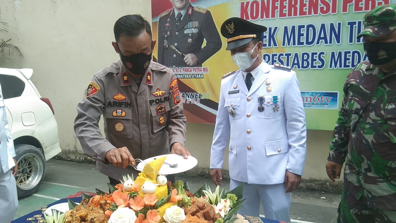 Medan, skalainfo.net |Personil Polsek Medan Timur dikejutkan kedatangan personil Koramil 0201 MT dan Kecamatan Medan Timur yang membawa nasi tumpeng saat Hari Ulang Tahun (HUT) Bhayangkara ke 75, Kamis (1/7/2021).