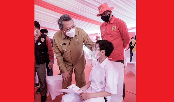 Tangerang, Skalainfo.net| Walikota Tangerang Selatan, Benyamin Davnie, menghadiri vaksinasi yang diberikan kepada siswa Al-Azhar BSD Tangerang Selatan (Tangsel). Vaksinasi merupakan bentuk ikhtiar pemerintah dalam penanganan Covid-19. Acara ini diselenggarakan di Sekolah Islam Al-Azhar BSD, Serpong, Senin, 19/7/2021.