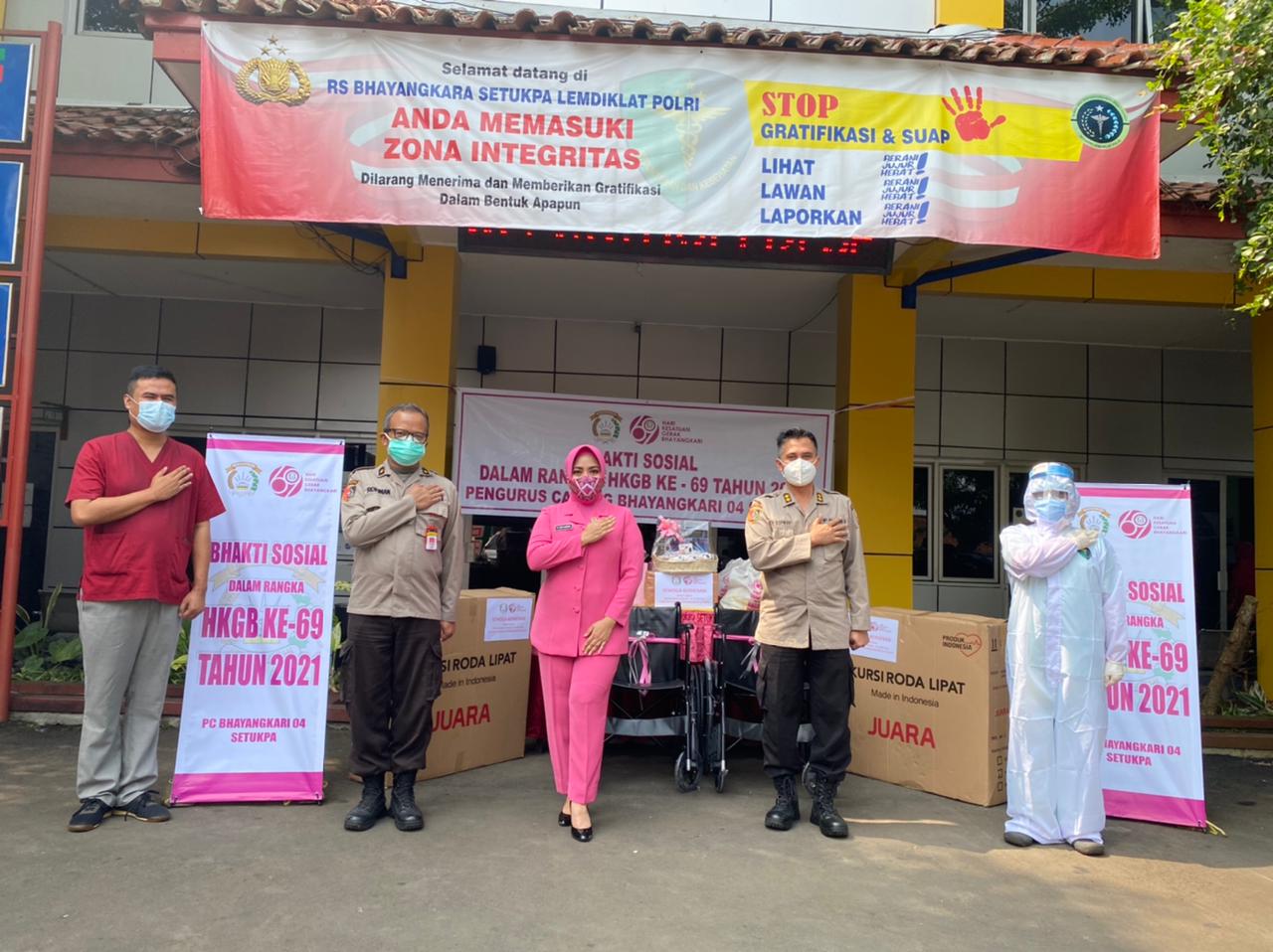 Sukabumi, skalainfo.net | Dalam rangka memperingati Hari Kesatuan Gerak Bhayangkari (HKGB) ke 69 tahun 2021, Pengurus Cabang Bhayangkari 04 Setukpa menggelar kegiatan Bakti Sosial (Baksos) dengan membagikan alat kesehatan (alkes) dan paket sembako di RS Bhayangkara Setukpa Lemdiklat Polri, Jumat 30/07/2021.