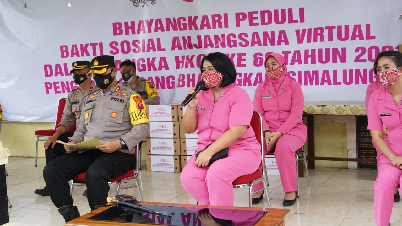 Sementara Ketua Bhayangkari Cabang Polres Simalungun Ny. Dona Dedy menyampaikan kegiatan bakti sosial ini dalam rangka memperingati Hari Kesatuan Gerak Bhayangkari (HKGB) Ke-69 Tahun 2021 yang jatuh tepat hari ini dengan tujuan sebagai rasa kemanusiaan dan solidaritas dari Pengurus Cabang Bhayangkari Simalungun kepada personel Polres dan Bhayangkari Cabang Simalungun yang melaksanakan Isoman dalam antisipasi penyebaran Virus Covid 19.