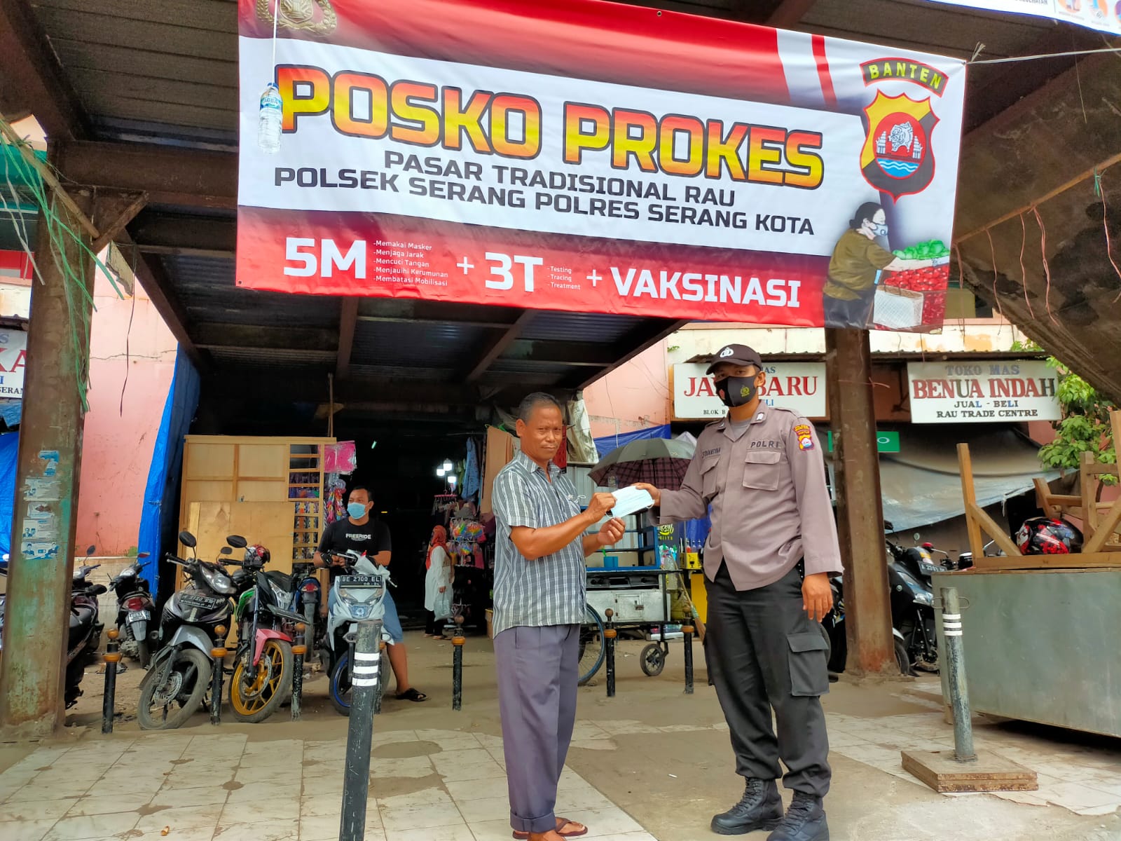 Bripka Ari Fidiansya melaksanakan Pembagian Masker di Pasar Rau Kota Serang. Sabtu (21/8/2021).
