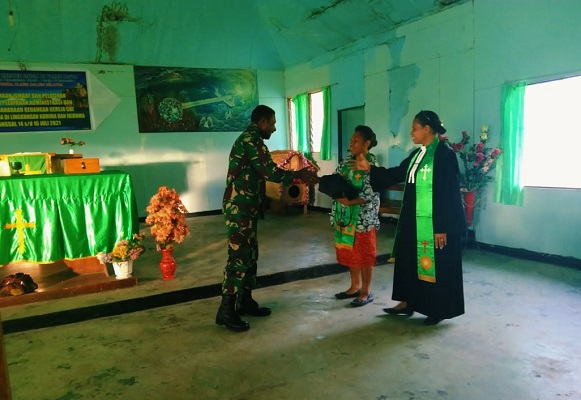 Sementara itu, Pendeta GKI Polimo Ibu Betti Kanikir S.Th mewakili jemaat mengungkapkan rasa terimakasihnya kepada anggota Pos Kurima Satgas Yonif RK 751/VJS atas bantuan Alkitab yang diberikan kepada jemaat.