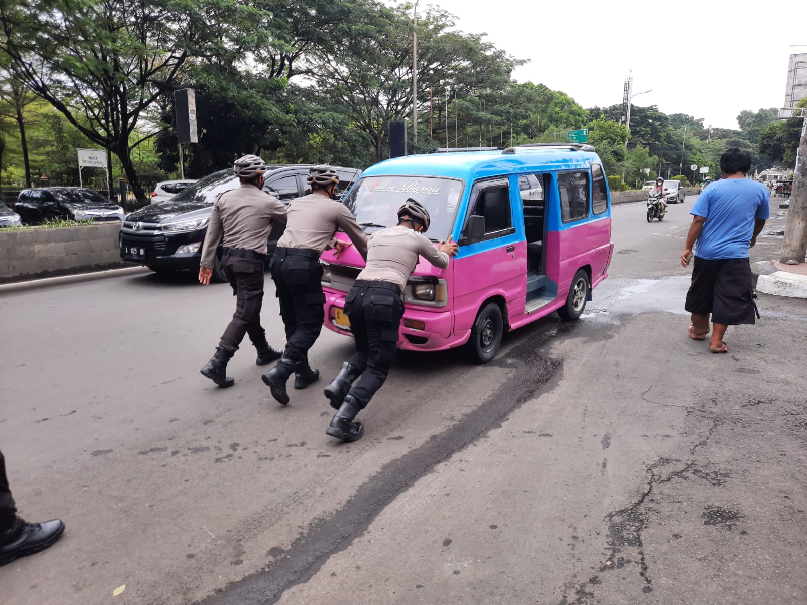 Tepat di depan pusat perbelanjaan Mall Serang, tampak Petugas, membantu salahsatu kendaraan angkutan umum yang kedapatan mengalami mogok.