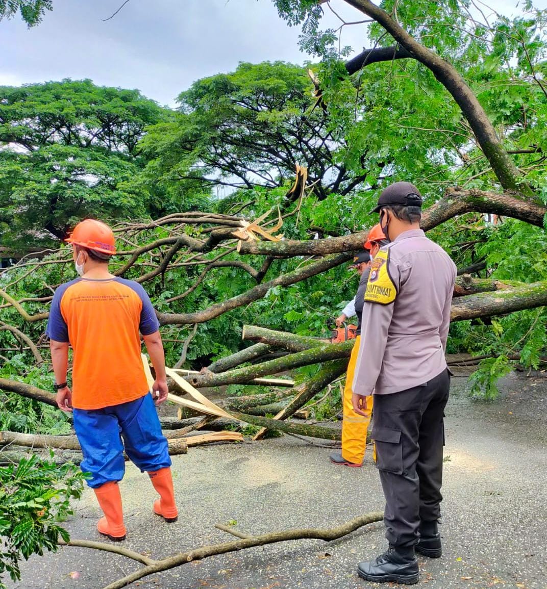 “Ya kan semalam hujan deras, diduga akar pohon sudah agak rapuh, ditambah dihantam angin, akhirnya tumbang. Menurut informasi sih tumbang sekitar pukul 01.00 WIB,” ucap Kapolsek, Selasa (14/9/2021).