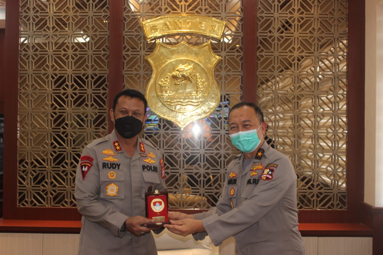 Pada saat di ruang kerja, Kapolda Banten Irjen Pol Dr. Rudy Heriyanto dan Tim Divhubinter Polri yang diwakili Sekretaris NCB-Interpol Indonesia Divhubinter Polri Brigjen Pol Amur Chandra J.B., S.H., M.H saling memberikan cendramata.