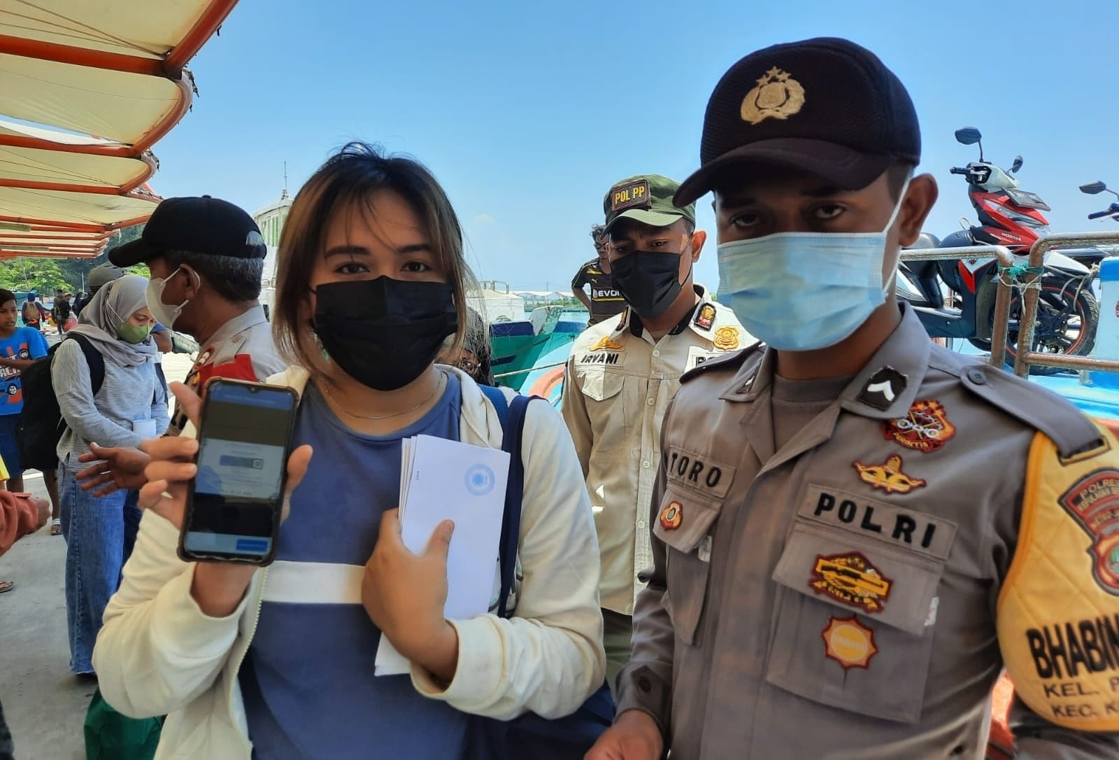 Tercatat hari ini ada 56 warga yang tiba di Pulau Kelapa, setelah dilakukan pengecekan sertifikat vaksin oleh Polsek Kepulauan Seribu Utara kemudian dihimbau untuk menerapkan ProKes selama di pulau dan dibagikan masker secara gratis.(Suratman/red)
