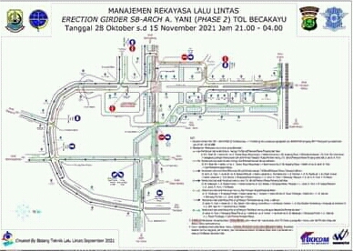 Bekasi, skalainfo.net | Manajemen Rekayasa Lalu Lintas Erection Girder SB-ARCH A.YANI TOL Becakayu melaksanakan Perubahan Rekayasa Jalan dari Tanggal 04 Oktober lalu sampai dengan tanggal 15 November 2021 nanti.