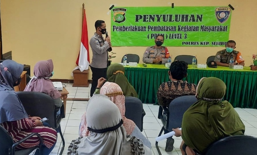 JAKARTA, skalainfo.net | Satuan Pembinaan Masyarakat (Sat Binmas) Polres Kepulauan Seribu terus melakukan penyuluhan terkait PPKM (Pemberlakuan Pembatasan Kegiatan Masyarakat) Level 3 (tiga) kepada warga masyarakat Kepulauan Seribu yang diadakan di Ruang Aula Kelurahan Pulau Untung Jawa Kecamatan Kepulauan Seribu Selatan. Selasa (12/10/2021).