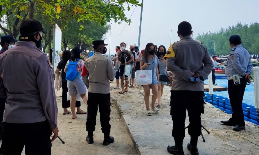 Mewajibkan warga dan wisatawan merapikan Protokol Kesehatan dan melakukan scan barcode aplikasi peduli lindungi saat tiba di pulau pemukiman.