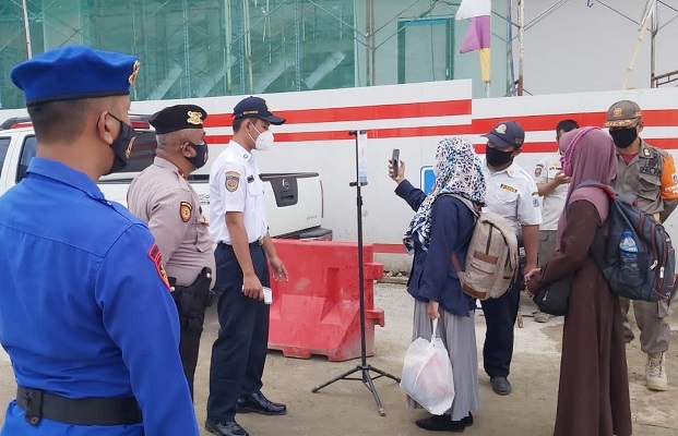 Selain himbauan protokol kesehatan terlihat aparat gabungan dari Polres Kepulauan Seribu bersama instansi terkait setempat meminta warga dan wisatawan melakukan scan barcode aplikasi peduli di pintu masuk Dermaga.