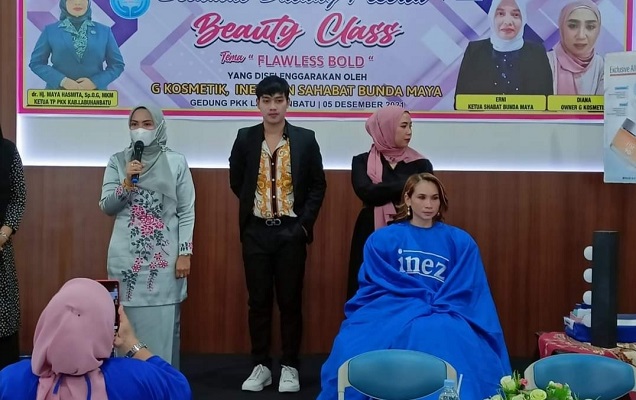 Rantauprapat, Skalainfo.net| Ketua Tim Penggerak (TP) PKK Kabupaten Labuhanbatu Ny. dr. Hj. Maya Hasmita Erik Adtrada Ritonga, Sp.OG., M.KM menghadiri acara Beauty Class yang diadakan G Kosmetik, Inez dan Sahabat Bunda Maya (SBM), di Aula Kantor PKK Kabupaten Labuhanbatu Kelurahan Padangmatinggi, Kecamatan Rantau Utara, Kabupaten Labuhanbatu, Sumatera Utara, Minggu, 05/12/2021.