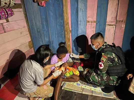 Dengan membawa peralatan kesehatan serta didampingi personel Nakes di Kampung Umuaf, selanjutnya secara darurat dilakukan proses persalinan di rumah Ibu Yustina, karena kondisi Ibu Yustina yang tidak memungkinkan untuk dibawa klinik.