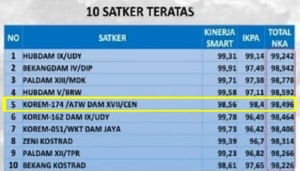 Dengan nilai SMART 98,56 dan IKPA 98,4 NKA Satker Korem 174/ATW Merauke mencapai nilai 98,496. Selama kepemimpinan Brigjen TNI Bangun Nawoko, Korem 174/ATW Merauke selalu menjadi nomor SATU, baik di tingkat Kabupaten Merauke bahkan di tingkat wilayah Provinsi Papua.