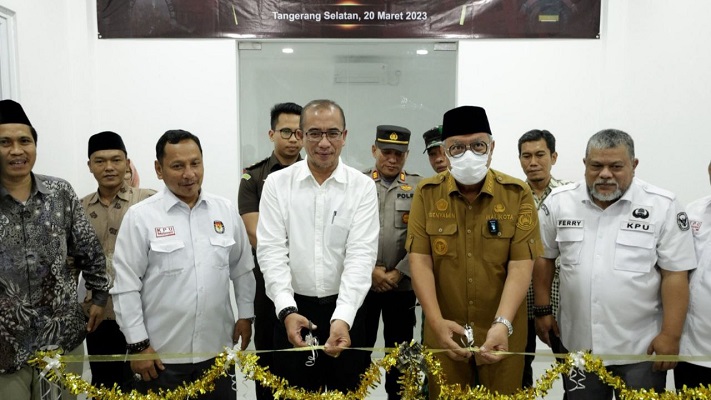 Tangsel, Skalainfo.net| Walikota Tangerang Selatan Benyamin Davnie bersama ketua Komisi Pemilihan Umum (KPU) Republik Indonesia Hasyim Asy’ari yang didampingi ketua KPU Kota Tangsel, M. Taufik MZ meresmikan Gudang Logistik KPU, yang terletak berdampingan dengan Kantor KPU Tangsel, Setu, pada Senin, (20/03/2023).