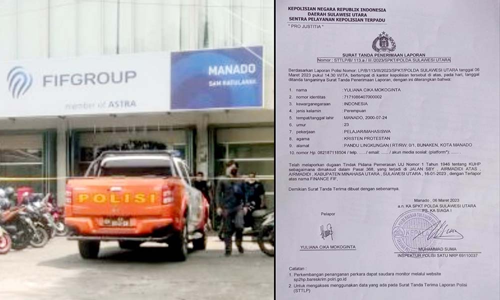 Manado, skalainfo.net | Perusahaan pembiayaan PT. Federal International Finance (FIF) Manado dilaporkan ke Kepolisian Daerah (Polda) Sulawesi Utara (Sulut) terkait dugaan perampasan sepeda motor milik Yuliana Cika Mokoginta, warga Kelurahan Pandu, Kecamatan Bunaken, Kota Manado, Senin (06/03/2023). Ketika dikonfirmasi, petugas di Sentra Pelayanan Kepolisian Terpadu (SPKT) Polda Sulut membenarkan adanya laporan tersebut.