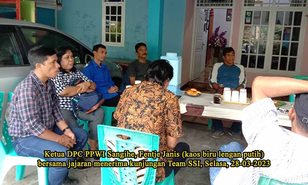 Tahuna, skalainfo.net | Ketua Save Sangihe Island (SSI), Jull Takaliuang, dan kawan-kawan melakukan kunjungan ke Sekretariat DPC PPWI Kabupaten Kepulauan Sangihe, Sulawesi Utara, Selasa (28/3/23). Team SSI disambut langsung Ketua PPWI Sangihe, Fentje Janis, S.H., S.Ip., S.Th, yang didampingi Wakil Ketua, Asriel Johan Tatande, S.E., Sekretaris, Ryvomoon T. Mumba, S.Pd., Wakil Sekretaris II, Jumbriyati Manabung, Bidang Organisasi, Rolly OA. Supit, dan Bidang Humas & Publikasi, Benyfasius Sasiang. Pertemuan berlangsung di Sekretariat DPC PPWI Sangihe, Jalan Tapuang Belakang, Kecamatan Tahuna Timur, Kabupaten Kepulauan Sangihe, Sulawesi.