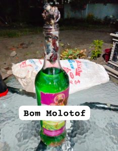 Dalam kejadian tersebut ditemukan tak jauh dari lokasi sebuah goni yang berbau minyak lampu yang dimana goni tersebut diduga sebagai sarana membawa botol kaca yang ditemukan sudah dicampur dengan BBM.