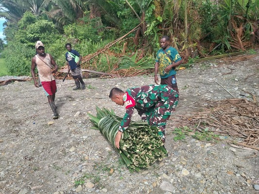 Timika, Skalainfo.net| Acara adat di Papua bernilai sangat sakral dan sangat dihormati oleh masyarakat setempat. Sebagai aparat teritorial, Babinsa Koramil 1710-03/Kuala Kencana menyadari bahwa hal tersebut perlu dijaga demi kelestarian adat budaya sebagai kekayaan Indonesia. Mempedomani hal tersebut, kali ini Babinsa Koramil 1710-03/Kuala Kencana dipimpin Serka Noben Wenda bersama warga bahu membahu mengambil pelepah daun sagu, Rabu, (24/01/2023) kemarin.