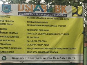 Pekerjaan proyek pembangunan jalan trotoar dan dreanase Pupem-Parakan dengan panjang kurang lebih 2000 meter yang dilaksanakan oleh CV. Karya Pelita Abadi dengan memakai sumber dana anggaran APBD Kota Tangsel Rp. 13.214.736.000,- waktu pelaksanaan kerja (180 hari kalender) dimulai pada tanggal 26 Juli 2023.
