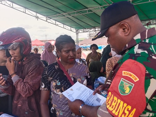 Timika, Skalainfo.net| Babinsa Koramil 02/Timika Kodim 1710/Mimika Koptu Irayan Faref dan Pratu Petrus menghadiri sekaligus lakukan pendampingan dan pengamanan kegiatan penyaluran Bantuan Langsung Tunai (BLT) Dana Desa oleh Kantor Pos dan Dinas Sosial, bertempat di Pasar Lama, Distrik Mimika Baru, Kab. Mimika, Sabtu, (17/2/2024).