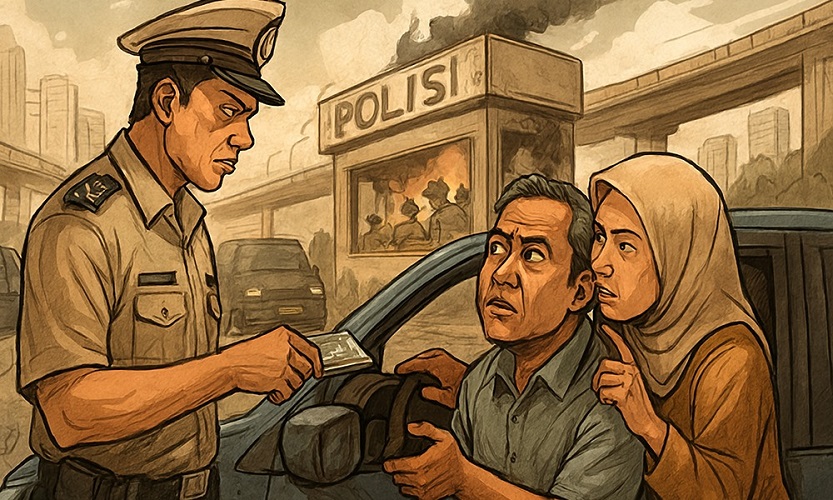 Kami menjelaskan bahwa penumpang itu adalah istri kami, hanya menumpang, dan sedang menelepon anaknya yang kami tinggalkan di rumah. Apakah itu termasuk pelanggaran? Polisi itu terdiam. Lima menit berlalu tanpa jawaban. Suasana hening, seperti semua orang menahan sesuatu.